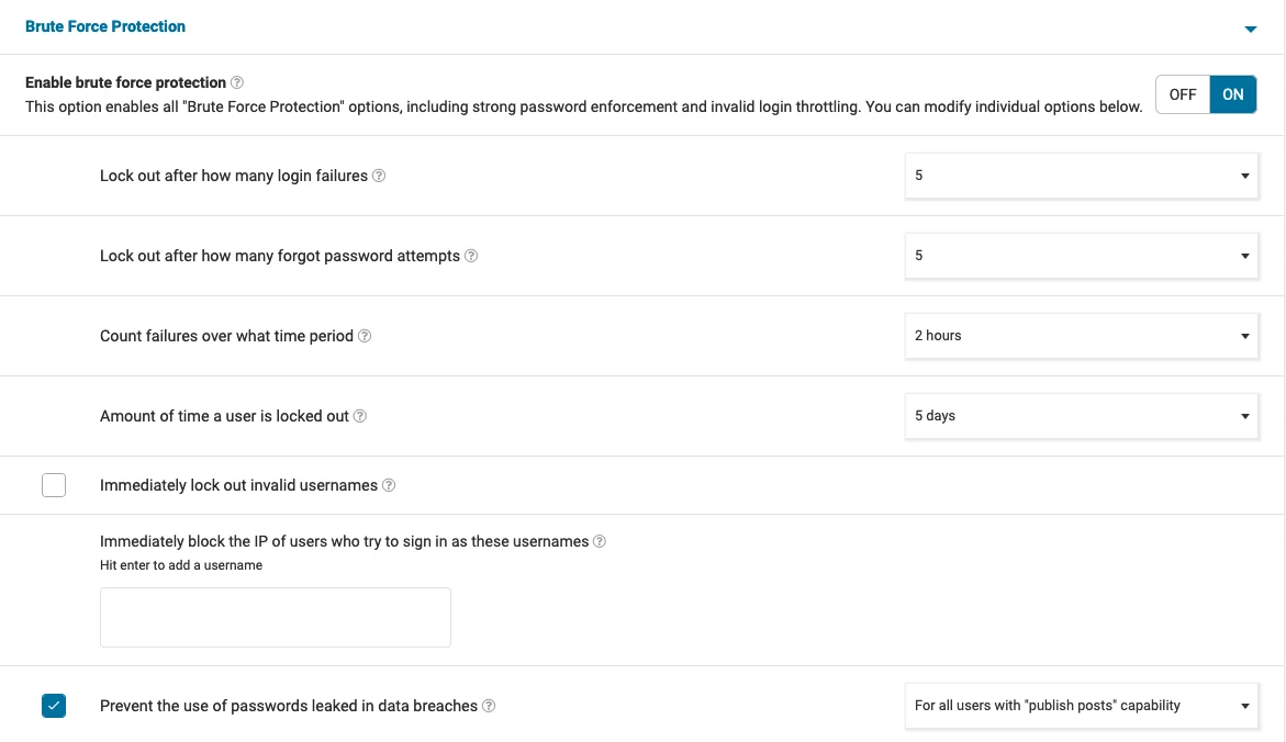 Prevent the use of passwords leaked in data breaches >> Enabled For all users with "publish posts" capability.
