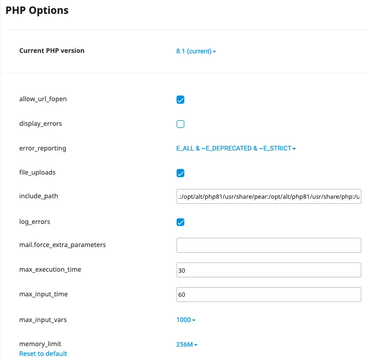 - We recommend setting the PHP Version to "Inherited" so you can use Select PHP Version to easily modify the PHP settings and modules.