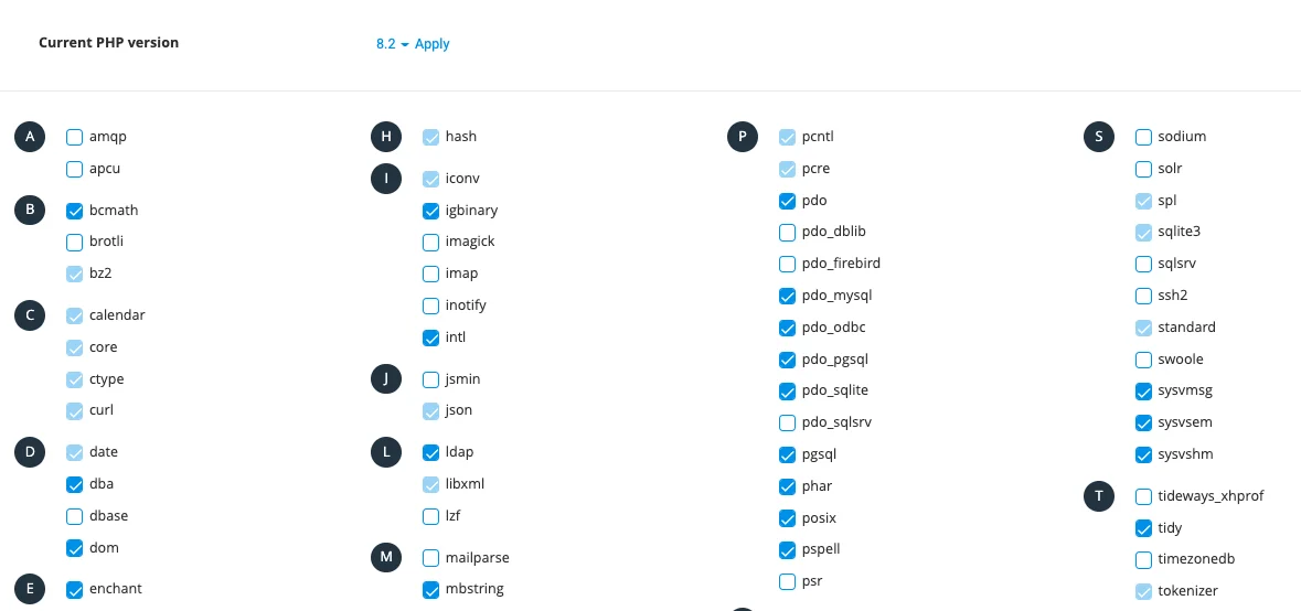 Enabling PHP extensions, Changing PHP Version and Setting PHP Options
