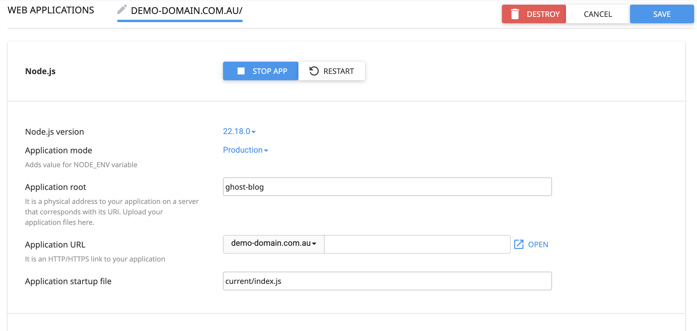 Note: Update application root for your environment. This can be either the absolute path to your cPanel account / ghost-blog directory or the relative path. NodeJS apps in cPanel also cannot installed in your domains document root - eg, you cannot install an app directly in ~/public_html but you can install it in ~/public_html/ghost-blog.