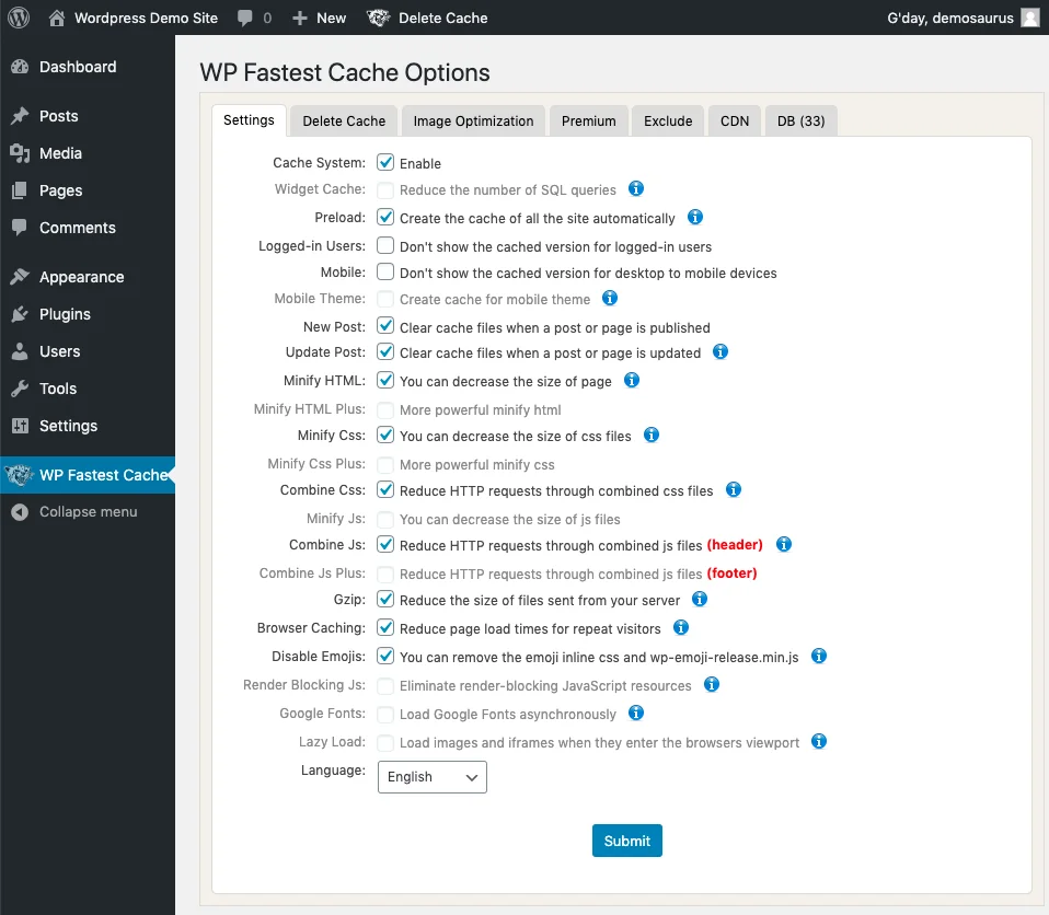 - Click Minify HTML, Minify Css[1], Combine Css[1], Combine Js, Gzip [2], Browser Caching and Disable Emojis. Click Submit.