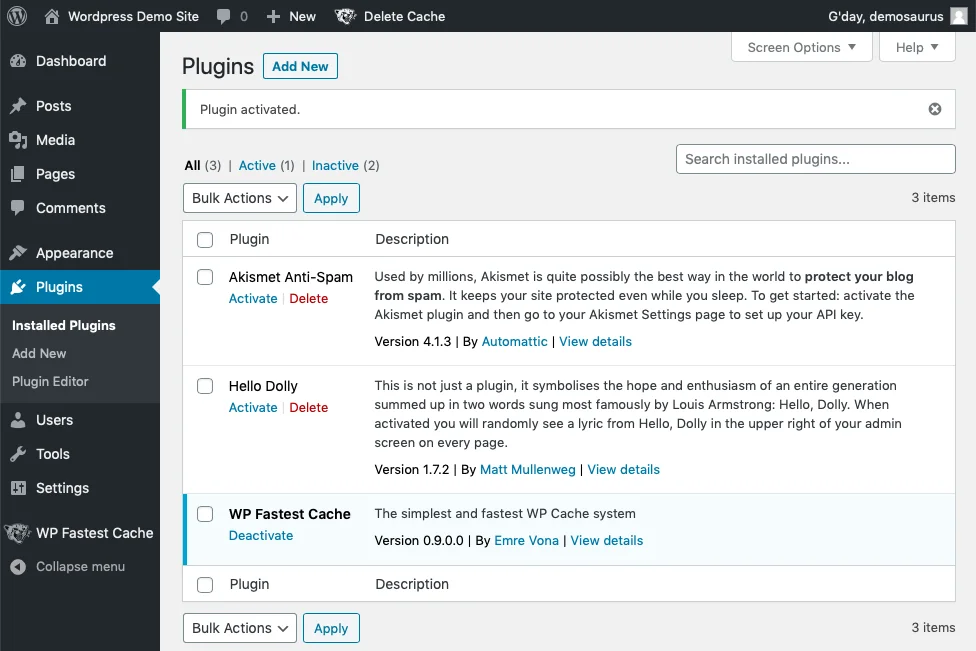 - When the plugin is activated, you'll see a confirmation message and will be on the Installed Plugins page. You'll also see WP Fastest Cache in the left-hand menu.